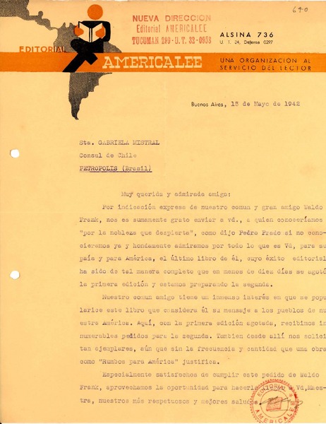 [Carta] 1942 mayo. 13, Buenos Aires [a] Gabriela Mistral, Petrópolis, Brasil [manuscrito] Editorial Américalee.