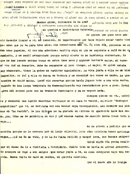 [Carta] 1943 dic. 24, Buenos Aires [a] Gabriela Mistral [manuscrito] Arturo Román.
