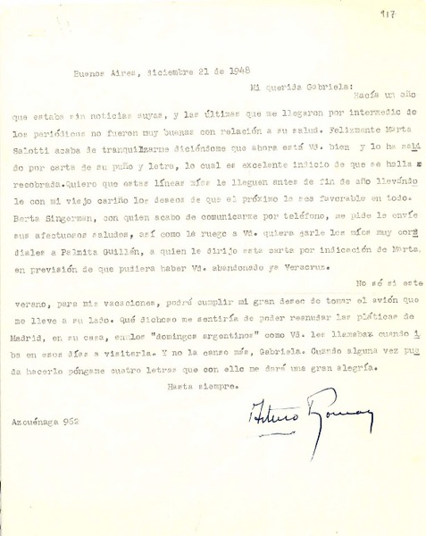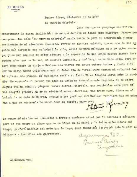 [Carta] 1947 dic. 28, Buenos Aires [a] Gabriela Mistral [manuscrito] Arturo Román.