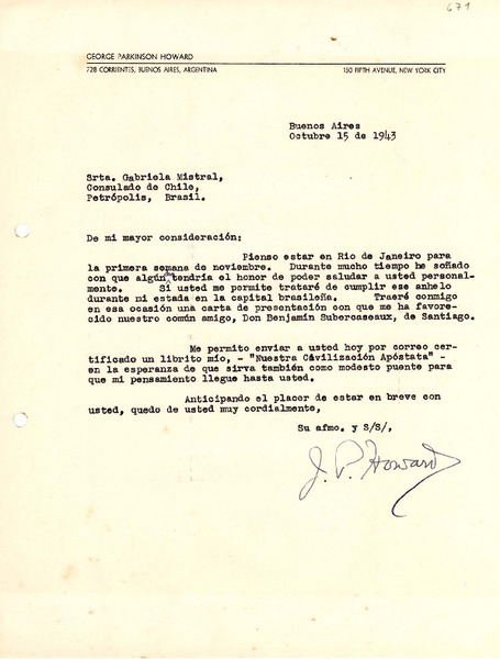 [Carta] 1943 oct. 15, Buenos Aires [a] Gabriela Mistral, Petrópolis, [Brasil] [manuscrito]G. P. Howard.
