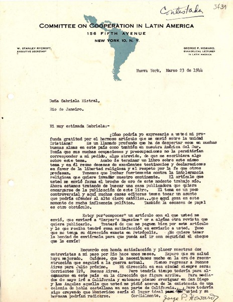 [Carta] 1944 mar. 23, Nueva York, EE.UU. [a] Gabriela Mistral, Río de Janeiro [manuscrito] George P. Howard.