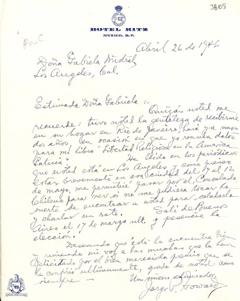[Carta] 1946 abr. 26, N. York [a] Gabriela Mistral, Los Angeles, California [manuscrito] George P. Howard.