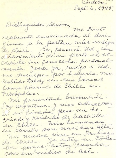 [Carta] 1945 sept. 6, Córdoba, Argentina [a] Gabriela Mistral, Petrópolis, [Brasil] [manuscrito] Ana H. de Brestovisky.