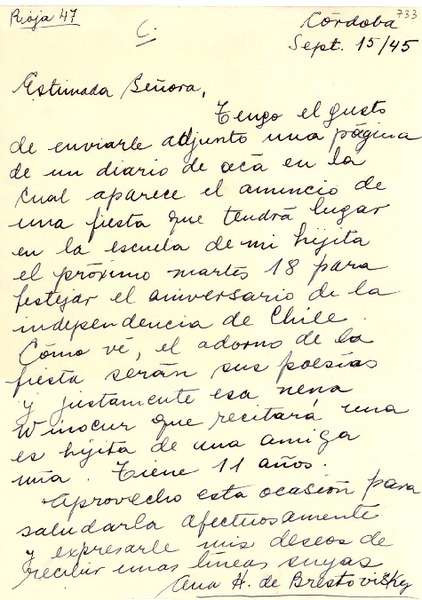 [Carta] 1945 sept. 15, Córdoba [Argentina a] Gabriela Mistral, Petrópolis, [Brasil] [manuscrito] Ana H. de Brestovisky.