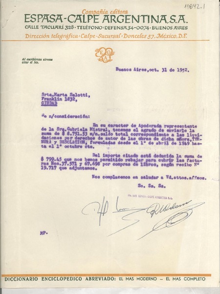 [Carta] 1952 oct. 31, Buenos Aires, [Argentina] [a] Marta [i.e. Martha] Salotti, [Argentina?] [manuscrito] Espasa-Calpe Argentina.