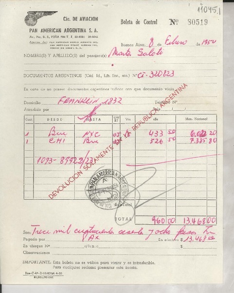 [Boleta de control] 1954 feb. 8, Buenos Aires, [Argentina] [manuscrito]