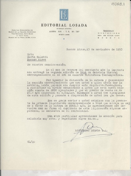 [Carta] 1953 nov. 13, Buenos Aires, [Argentina] [a] Marta [i.e. Martha] Salotti, Buenos Aires, [Argentina] [manuscrito] Gonzalo Losada.