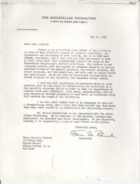 [Carta] 1954 May 18, New York [a] Gabriela Mistral [manuscrito] Secretaria The Rockefeller Foundation.