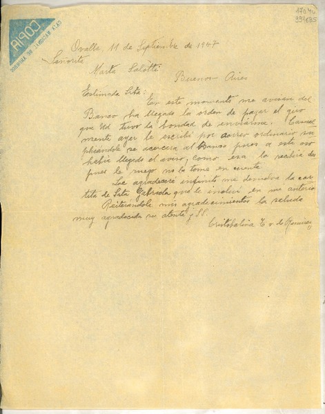 [Carta] 1947 sept. 11, Ovalle [a] Marta Salotti, Buenos Aires [manuscrito] Cristobalina T. de Ramírez.