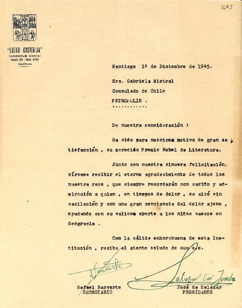 [Carta] 1945 dic. 1, Santiago, [Chile] [a] Gabriela Mistral, Petrópolis, [Brasil] [manuscrito] Rafael Narvarte, José de Salazar