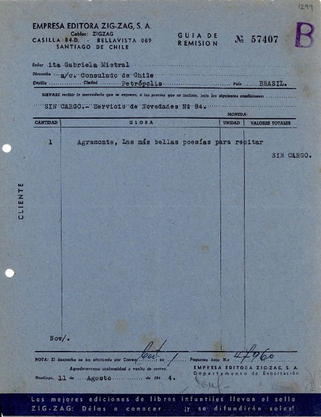 [Recibo] 1944 ago. 11, Santiago [a] Gabriela Mistral, Petrópolis [manuscrito] Empresa Editora Zig-Zag.