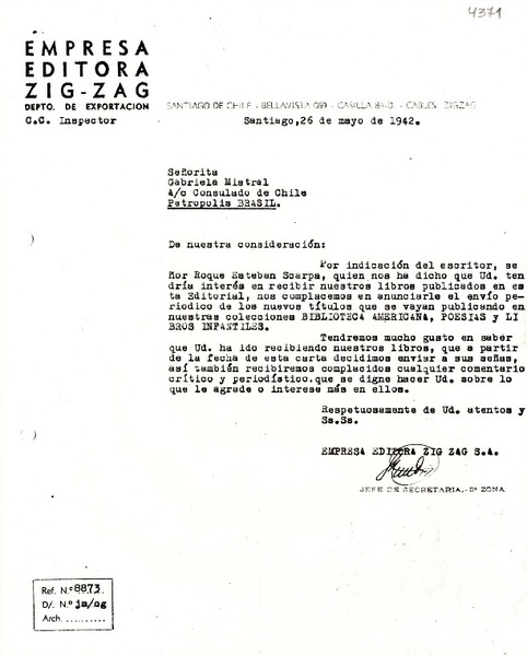[Carta] 1942 mayo 26, Santiago [a] Gabriela Mistral, Petrópolis [manuscrito] Empresa Editora Zig-Zag