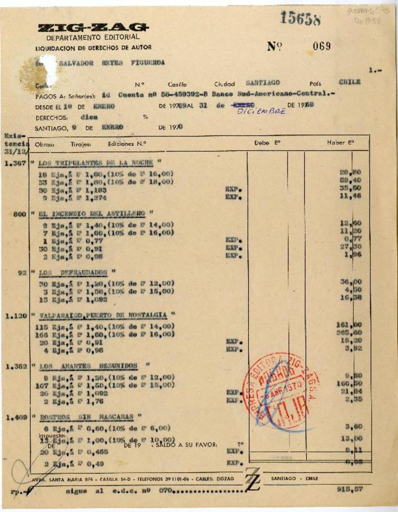 Santiago, Chile [a] Salvador Reyes Liquidaciones de derechos de autor, entre 1960 y 1969, [manuscrito] Empresa Editora Zig-Zag.