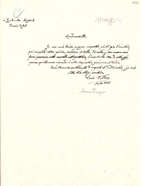 [Carta] [1945 mayo], [Santiago, Chile] [a] Gabriela Mistral [manuscrito] Louis Felhoen.