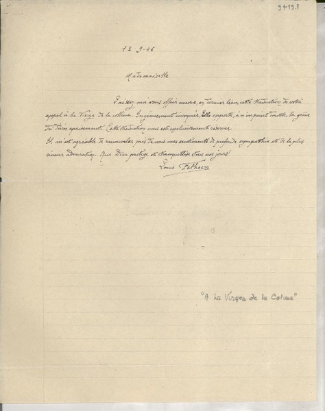 [Carta] 1947 sept. 13, Paris, [Francia] [a] Gabriela Mistral [manuscrito] Louis Felhoen.
