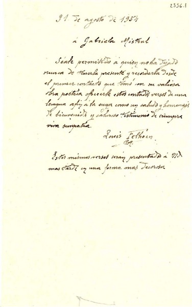 [Carta] 1954 ago. 31, [Limache] [a] Gabriela Mistral [manuscrito] Louis Felhoen.