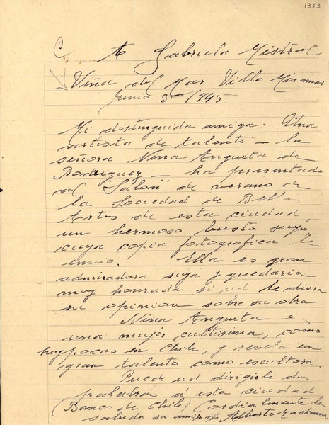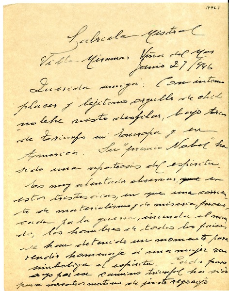 [Carta] 1945 jun. 3, Viña del Mar, [Chile] [a] Gabriela Mistral [manuscrito] Alberto Mackenna.