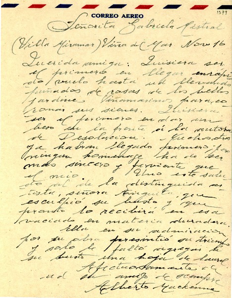 [Carta] 1945 nov. 16, Viña del Mar [a] Gabriela Mistral [manuscrito] Alberto Mackenna.