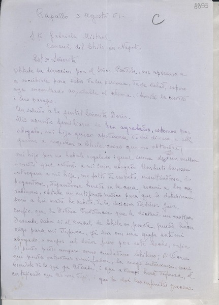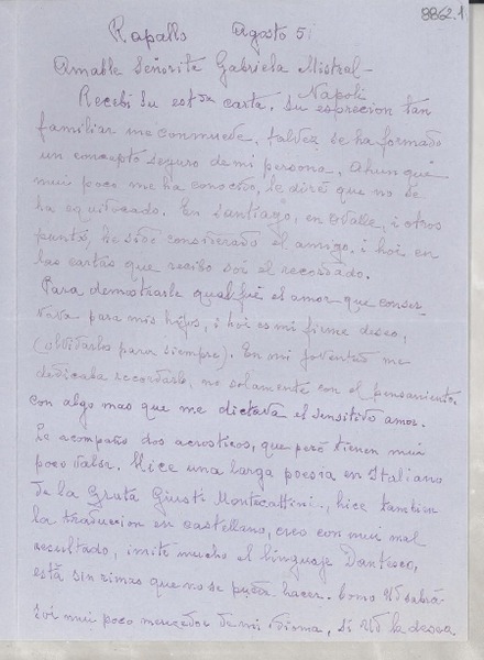 [Carta] 1951 ago., Rapallo, [Italia] [a] Gabriela Mistral, Napoli [manuscrito] Ambrosio Ghizolfo Medina.