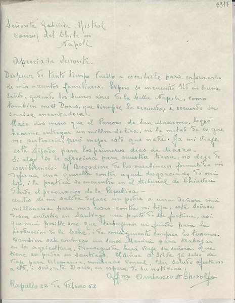 [Carta] 1952 feb. 22, Rapallo [a] Gabriela Mistral, Napoli [manuscrito] Ambrosio Ghizolfo.