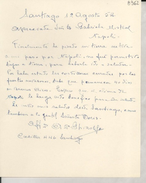 [Carta] 1952 ago. 12, Santiago, [Chile] [a] Gabriela Mistral, Napoli [manuscrito] [Ambrosio] Ghizolfo.