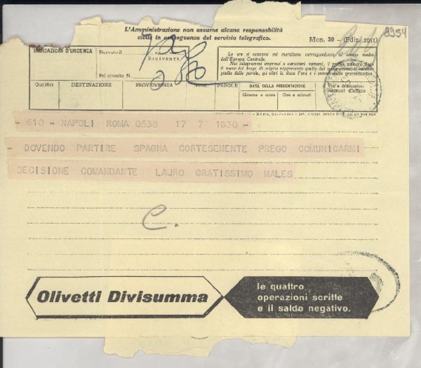 [Telegrama] 1952 ag. 7, Roma, [Italia] [a] Gabriela Mistral, Napoli [manuscrito] [Liubimiro] Males.