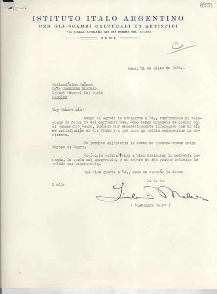 [Carta] 1952 jul. 31, Roma, [Italia] [a] Gabriela Mistral, Nápoles [manuscrito] Liubimiro Males.