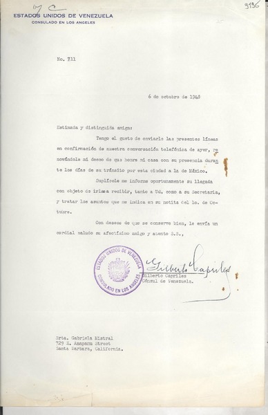 [Carta] 1948 oct. 6, Los Ángeles, [E.E.U.U.] [a] Gabriela Mistral, Santa Bárbara, California [manuscrito] Gilberto Capriles.