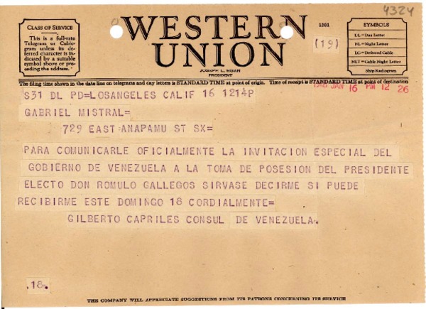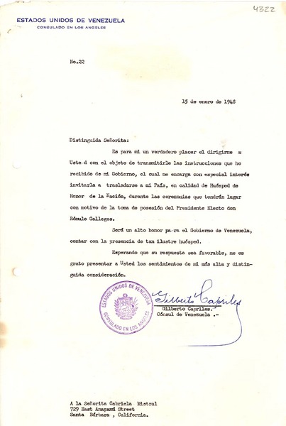 [Carta] 1948 ene. 15, Los Angeles, [E.E.U.U.] [a] Gabriela Mistral, Santa Barbara, California [manuscrito] Gilberto Capriles.