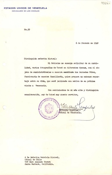 [Carta] 1948 feb. 6, Los Angeles, [E.E.U.U.] [a] Gabriela Mistral, Santa Barbara, California [manuscrito] Gilberto Capriles.