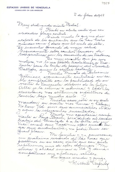 [Carta] 1948 feb. 2, Los Angeles, [E.E.U.U.] [a] [Gabriela Mistral] [manuscrito] Gilberto Capriles.