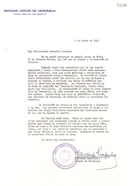 [Carta] 1948 mar. 4, Los Angeles, [E.E.U.U.] [a] [Gabriela] Mistral [manuscrito] Gilberto Capriles.