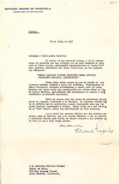[Carta] 1948 jul. 28, Los Ángeles, [E.E.U.U.] [a] Gabriela Mistral, Santa Bárbara, California [manuscrito] Gilberto Capriles.