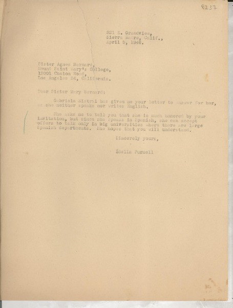 [Carta] 1946 Apr. 5, Sierra Madre, Calif., [EE.UU.] [a la] Sister Agnes Barnard, Los Angeles, California, [EE.UU.] [manuscrito] Idella Purnell.