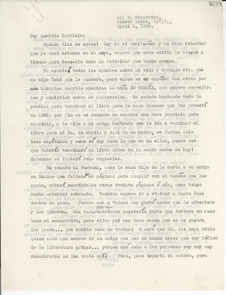 [Carta] 1949 Apr. 1, Sierra Madre, California [a] Gabriela Mistral [manuscrito] Adela [Purnell de Stone].