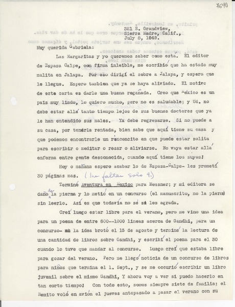 [Carta] 1949 July 11, Sierra Madre, California [a] Gabriela Mistral [manuscrito] Adela [Purnell de Stone].
