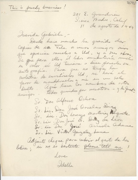 [Carta] 1949 ago. 11, Sierra Madre, California [a] Gabriela Mistral [manuscrito] Idella [Purnell de Stone].