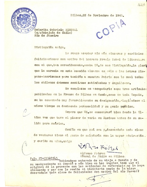 [Carta] 1945 nov. 22, Bilbao, [España] [a] Gabriela Mistral, Rio de Janeiro, [Brasil] [manuscrito] Alfonso Fabres.