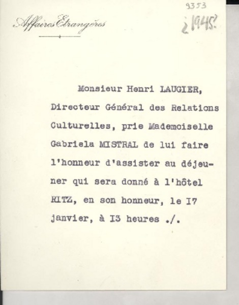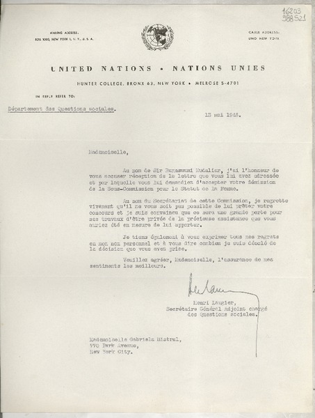 [Carta] 1946 mai 13, New York, [Estados Unidos] [a] Mademoiselle Gabriela Mistral, 770 Park Avenue, New York City [manuscrito] Henri Laugier.