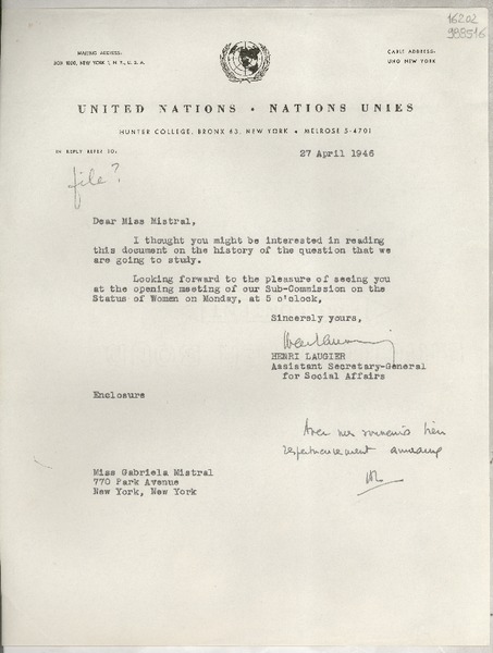 [Carta] 1946 Apr. 27, New York, [Estados Unidos] [a] Miss Gabriela Mistral, 770 Park Avenue, New York [manuscrito] Henri Laugier.
