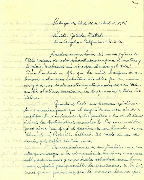 [Carta] 1946 abr. 11, Santiago, Chile [a] Gabriela Mistral, Los Angeles, California, Estados Unidos [manuscrito] Rea Filena Valenzuela.