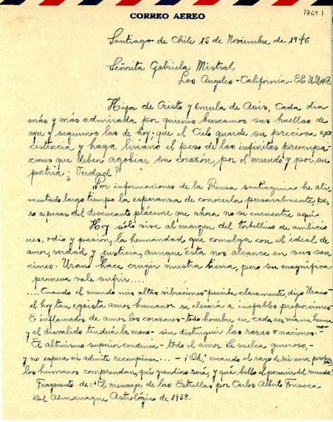 [Carta] 1946 abr. 21, Santiago, Chile [a] Gabriela Mistral, Los Angeles, California, Estados Unidos [manuscrito] Rea Filena Valenzuela.