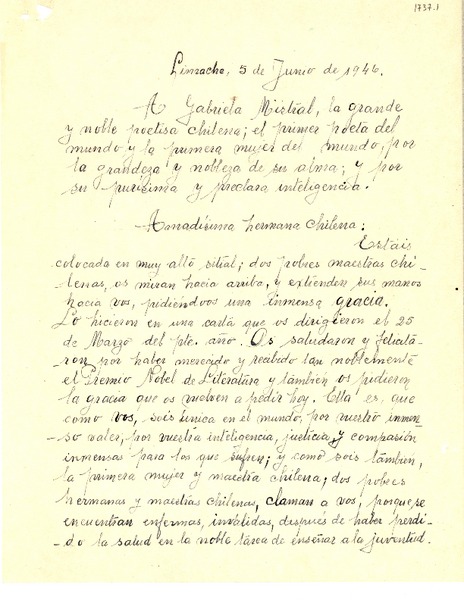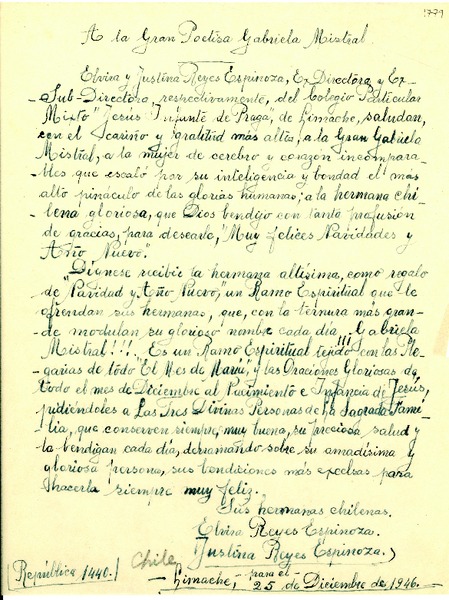 [Carta] 1946 dic. 12, Limache [a] Gabriela Mistral, Los Ángeles [manuscrito] Elvira y Justina Reyes Espinoza.