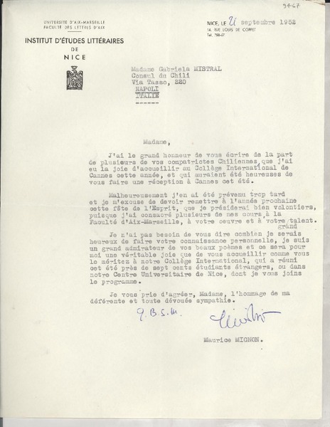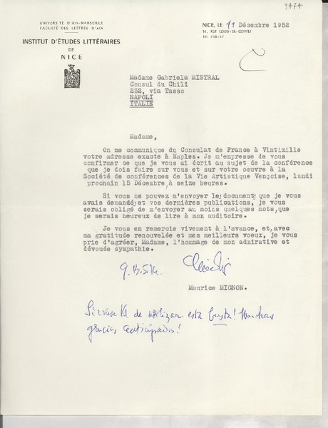 [Carta] 1952 déc. 11, Nice, [Francia] [a] Gabriela Mistral, Napoli, Italie [manuscrito] Maurice Mignon.