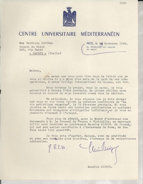 [Carta] 1952 nov. 29, Nice, [Francia] [a] Gabriela Mistral, Naples, Italie [manuscrito] Maurice Mignon.
