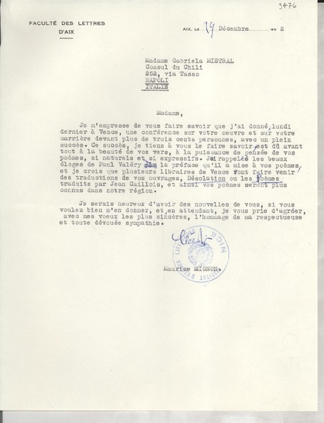 [Carta] 1952 déc. 19, Aix, [Francia] [a] Gabriela Mistral, Napoli, Italie [manuscrito] Maurice Mignon.