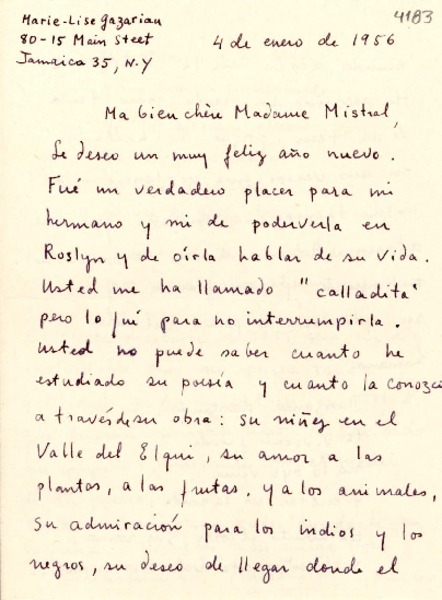 [Carta] 1956 ene. 4, New York [a] Gabriela Mistral, Roslyn Harbor, New York [manuscrito] Marie Lise Gazarian.
