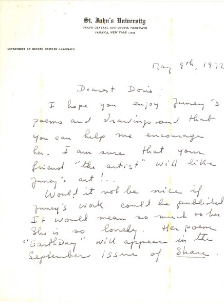 [Carta] 1972 may. 9, [New York, Estados Unidos] [a] Doris [Dana] [manuscrito] Marie-Lise.