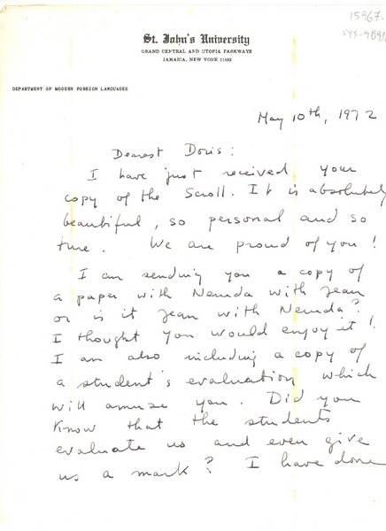 [Carta] 1972 may 10, [New York, Estados Unidos] [a] Doris [Dana] [manuscrito] Marie-Lise.