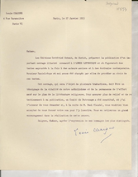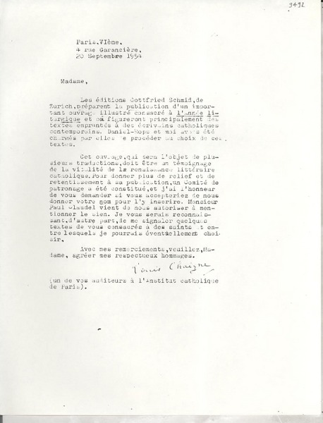 [Carta] 1954 sept. 20, Paris, [France] [a] Madame [Gabriela Mistral] [manuscrito] Louis Chaigne.
